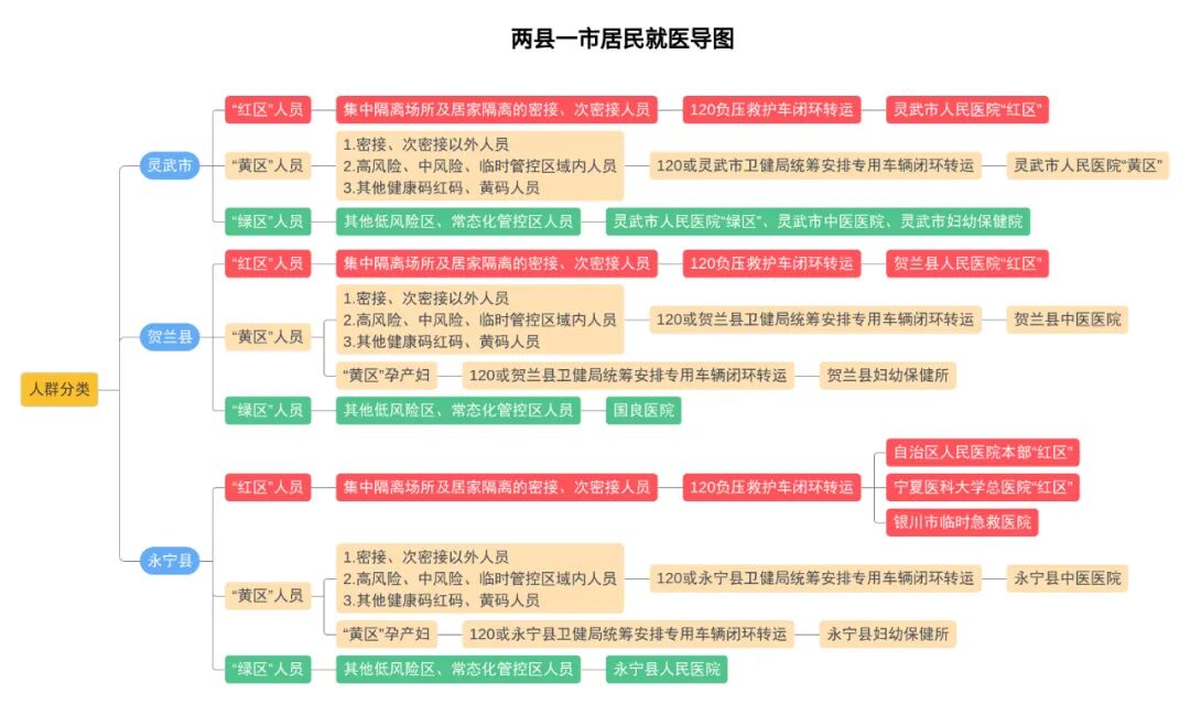贺兰县:“红区”人员由120负压救护车闭环转运至贺兰县人民医院“红区”诊疗;“黄区”人员由120或贺兰县卫健局统筹安排专用车辆闭环转运至贺兰县中医医院诊疗,“黄区”孕产妇转运至贺兰县妇幼保健所诊疗;“绿区”人员自行前往国良医院诊疗。