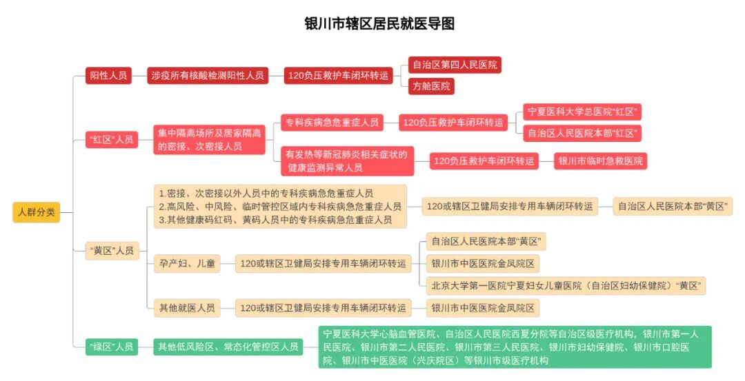 永宁县:“红区”人员由120负压救护车闭环转运至自治区人民医院“红区”、宁夏医科大学总医院“红区”及银川市临时急救医院诊疗;“黄区”人员由120或永宁县卫健局统筹安排专用车辆闭环转运至永宁县中医医院诊疗,“黄区”孕产妇转运至永宁县妇幼保健所诊疗;“绿区”人员自行前往永宁县人民医院诊疗。