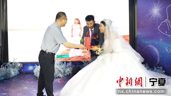 中新网宁夏新闻6月14日电 (记者 李佩珊)6月13日,在宁夏兴庆区掌政镇,没有奢侈的酒店,没有华丽的布置,在亲朋好友的见证与祝福下,一场热闹的“低彩礼”婚礼吸引了兴庆区委副书记王建刚的关注,他作为证婚人,代表兴庆区赠予一对新人婚俗新风的大“囍包”。