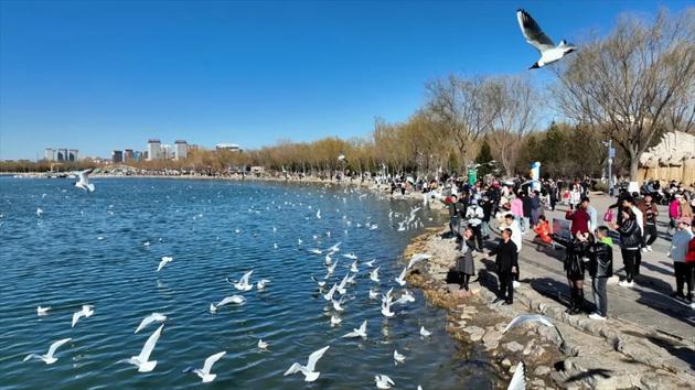 ▲北塔湖迎来大批南迁的红嘴鸥驻足、栖息,吸引众多市民前来观赏。