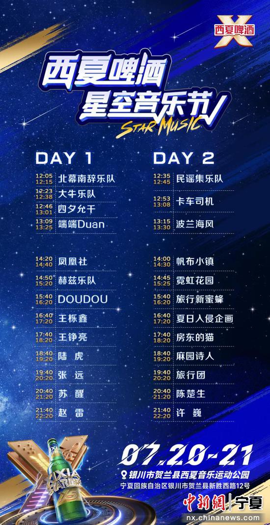 中新网宁夏新闻7月19日电 (记者 李佩珊)7月20日至21日,西夏星空音乐节将在宁夏银川市贺兰县西夏啤酒音乐运动公园拉开帷幕,一场群“星”闪耀、“唱”游星空的音乐盛典即将精彩绽放。