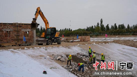 不只在大新镇,走进兴庆区掌政镇强家庙村和通贵乡河滩村高标准农田建设项目(渠灌改滴灌)二标段施工现场,机器轰鸣,各式机械来回作业,工人们干得热火朝天,一座 9.5 万方调蓄水池正悄然而起。
