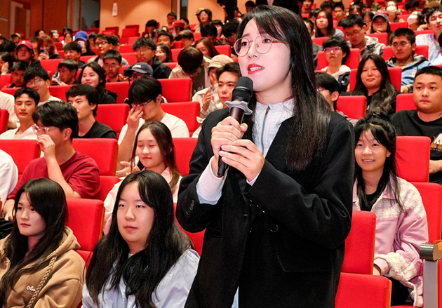 聆听宣讲的大学生与劳模工匠问答互动。