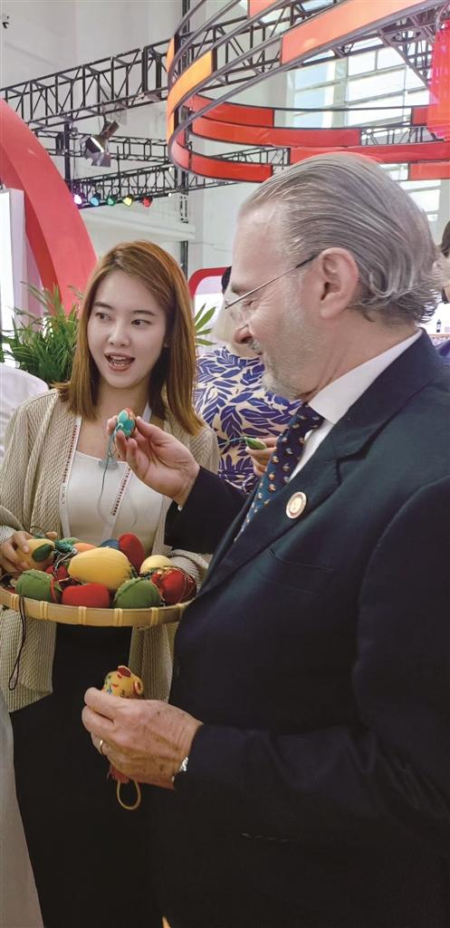 第四届中国(宁夏)国际葡萄酒文化旅游博览会西吉县农文旅品牌营销推介活动上,马兰刺绣产品受到外宾欢迎。受访者供图