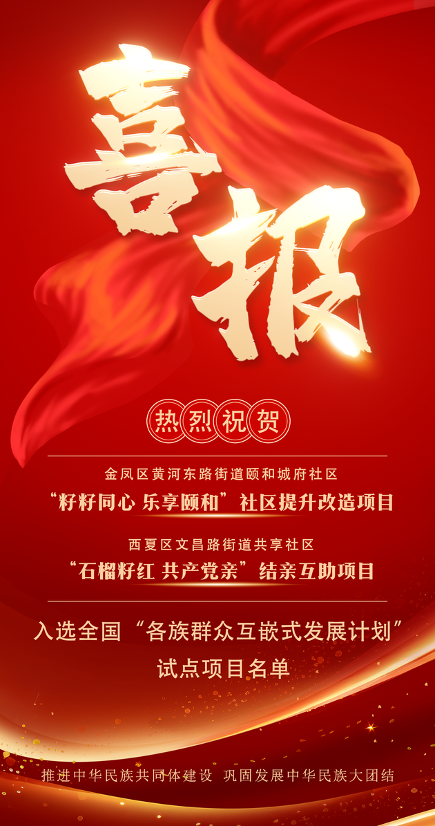 国家民委近日对外公布2024年度“各族群众互嵌式发展计划”试点项目名单,银川市金凤区黄河东路街道颐和城府社区“籽籽同心 乐享颐和”社区提升改造、西夏区文昌路街道共享社区“石榴籽红 共产党亲”结亲互助两个项目成功入选“多民族群众互嵌式社区建设”试点项目名单,全国共入选27个,宁夏仅入选的2个均为我市申报项目。