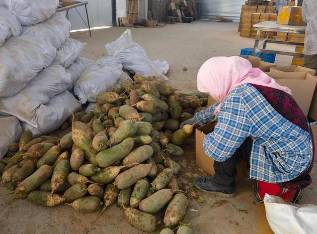 12月16日16时许,在贺兰县金贵镇银河村商贸物流中心,几位村民在熟练地称重、装箱、封装,他们手中是乍看不起眼、吃起来却嘎嘣脆的红心水果萝卜,此时,一辆快递揽投车轻车熟路地停到门口,准备将打包好的萝卜发往全国各地。