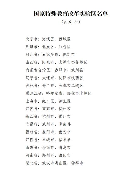 记者2月10日从教育部获悉,经各地自主申报、省级推荐、网络公示等环节,认定北京市海淀区等61个国家特殊教育改革实验区。其中,宁夏中宁县榜上有名。