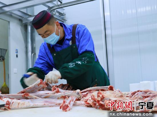 近日,在宁夏伊鑫瑞牛羊肉产业园加工区,工人们正在流水线上切割肉品,当天,166单500多公斤的牛肉打包完成,乘坐专机前往浙江省杭州市。