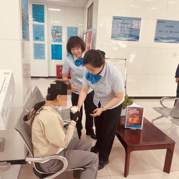 员工们迅速分工、高效协作:一人快步上前安抚客户情绪,轻声询问身体状况;另一人按照预案指引,快速取来温水和糖果,调整休息区座椅让其舒适倚靠;同时,其他员工有序维持现场秩序,确保空气流通,并紧急联系客户家属,做好随时呼叫医疗救助的准备。在等待家属的过程中,员工始终守在一旁悉心陪护,为客户冲泡糖水,小心搀扶其到休息区静养,用细致关怀缓解她的不适。
