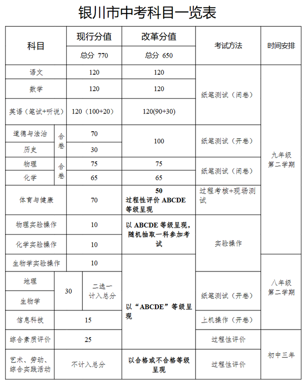 银川市教育局相关人员介绍,其实变化有六点,一是英语在总分120分不变的前提下,将听力由原来的20分调整为30分,变化点100+20改成了90+30。二是取消体育过程性评价20分,调整为ABCDE等级呈现。三是取消理、化、生实验操作30分,调整为ABCDE等级呈现。四是取消地理、生物学30分,调整为ABCDE等级呈现。五是取消信息科技15分,调整为ABCDE等级呈现。六是取消综合素质评价25分,调整为ABCDE等级呈现。
