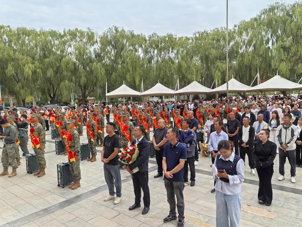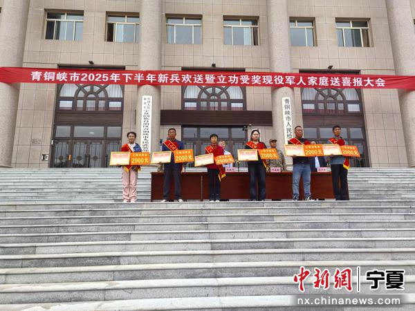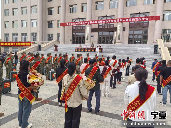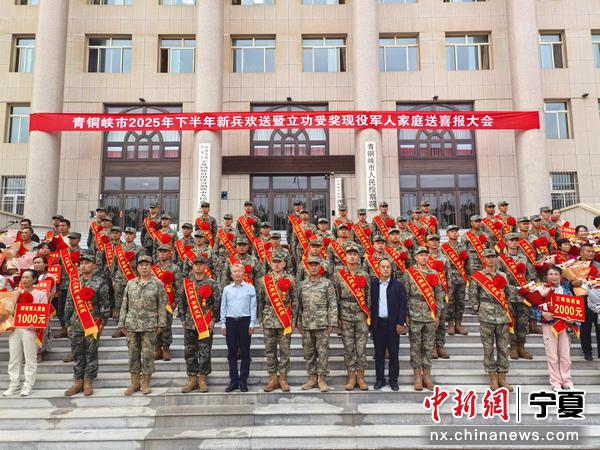 中新网宁夏新闻9月19日电 (记者 胡耀荣)金秋九月送新兵,热血青年踏征程。为营造全社会尊崇军人的浓厚氛围、激励更多优秀青年踊跃参军报国,9月17日,青铜峡市举行2025年下半年新兵欢送暨立功受奖现役军人家庭送喜报大会,为即将开启军旅生涯、奔赴祖国各地的新兵们送行,现场气氛庄重而热烈,洋溢着对新兵的敬意与祝福。