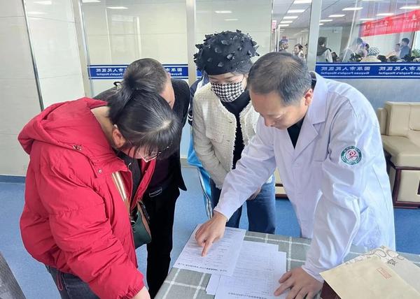 潘广玉为患儿家属介绍前往北京做手术需要准备的资料。