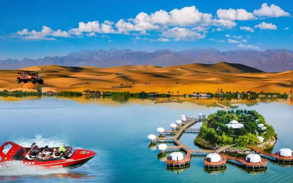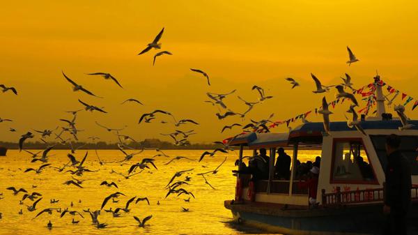 宁夏沙湖,22.52平方公里的沙漠与45平方公里的水域毗邻而居,既有大漠戈壁之雄厚,又有江南水乡之秀美,春日观鸟,夏日戏水,秋赏芦苇,冬日看雪,四季皆景,是中国35个王牌景点之一、中国十大魅力湿地之一、中国十大休闲湖泊之一,获得“中国年度休闲养生度假胜地”等称号。