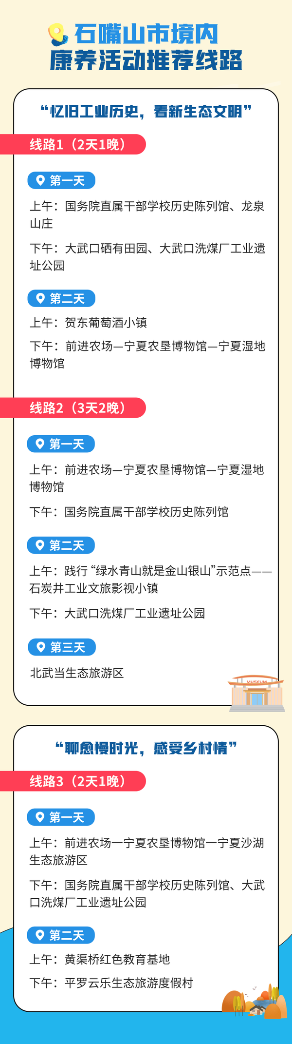 值此盛会召开之际,“感受发展变化 乐享银龄生活”文化康养活动宁夏境内首批推荐线路正式发布。这些线路专为长者设计,浓缩五市精华、行程舒缓、内涵丰富,旨在让每一位游客都能体验真正的品质康养游。请收藏这份线路图,开启您的“塞上江南”颐养之旅吧!