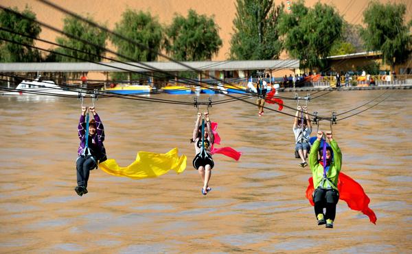 沙坡头旅游景区地处中国第四大沙漠——腾格里沙漠东南边缘,这里黄河、大漠、高山、绿洲汇聚一处,既具江南景色之秀美,又兼西北风光之雄奇。黄河在这里划下一个独特的“U”型大湾,这里有天下黄河第一漂的黄河祁连山大峡谷漂流、中国首创世界唯一的沙漠大扶梯、天然形成的国际滑沙中心、横跨黄河820米的黄河飞索、惊险刺激的黄河蹦极,被称为“中国十大最好玩的地方”。