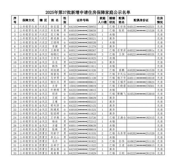 经银川市住房和城乡建设局、三区审核部门、各街道办事处核查,徐宝国等33户家庭符合银川市住房保障条件,现予以公示,广泛接受社会监督。