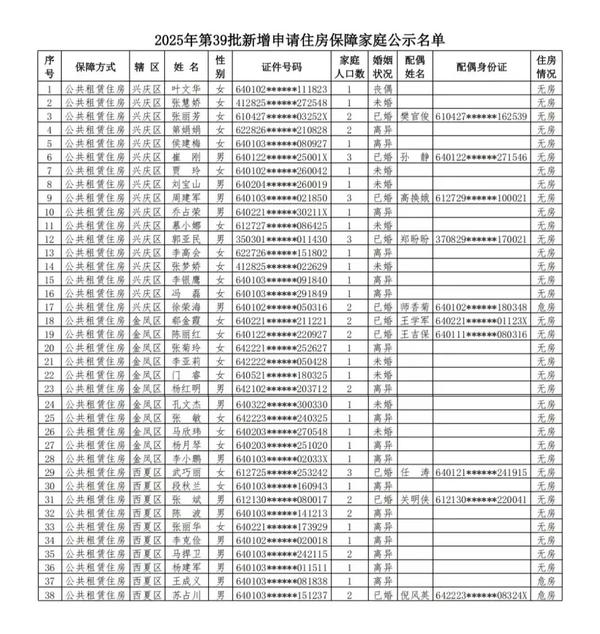 银川市住房和城乡建设局,公布最新一批住房保障家庭名单,叶文华等38户家庭在列。