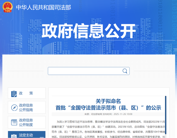 司法部按照客观公正、公开透明、务求实效、为基层减负的原则,对候选地区开展专家评审、社会调查、征求有关部门意见等工作,确定了首批“全国守法普法示范市(县、区)”拟命名名单。