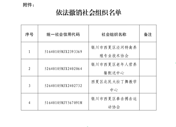 被撤销登记的社会组织自本公告公布之日起,不得开展除清算以外的任何活动。被撤销登记的社会组织《社会团体登记证书》正副本、《民办非企业单位登记证书》正副本及相关印章,自公告之日起予以作废。同时依据《社会组织信用信息管理办法》的有关规定,自行政处罚生效之日起,银川市西夏区泾河特禽养殖专业技术协会等4家社会组织列入社会组织严重违法失信名单。