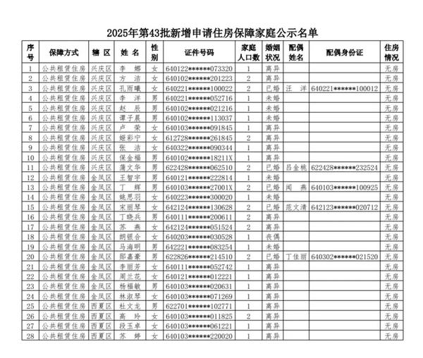 12月22日,宁夏银川市住房和城乡建设局公布最新一批住房保障家庭名单,李娜等28户家庭在列。