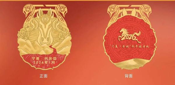 奖牌以2026年生肖“马”为核心视觉元素,正面以马蹄铁为造型基础,中央金色马首栩栩如生,周围火焰纹理环绕,底部渐层红底色搭配烟花图案,上方金色线条勾勒贺兰山轮廓,尽显宁夏地域特色;背面则将“2026”数字与奔腾马形线条相融,象征着勇往直前的赛事精神,金色与红色的碰撞,既寓意荣耀活力,又传递着新年奋进的美好祝愿。
