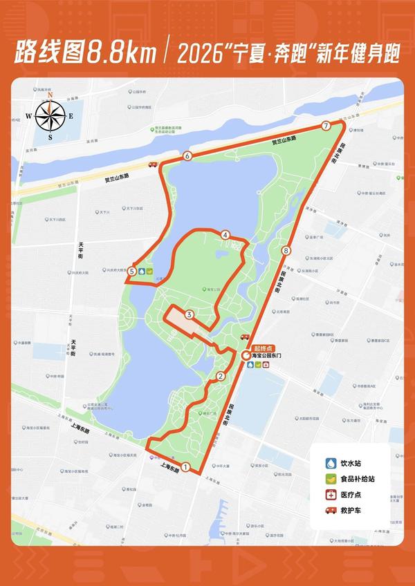 本次赛事全程8.8㎞,路线设计巧妙串联城市风光,起点与终点均设于海宝公园东门,跑友们将沿民族北街、上海东路、进宁北街等路段前行,再经海宝公园内部路、环湖路等完成全程。