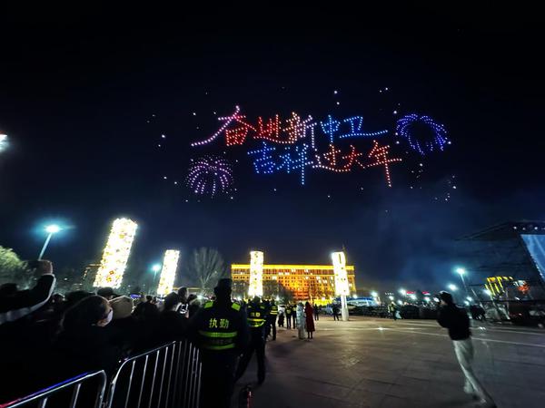 与此同时,千架无人机同步腾空,在夜幕中列阵变幻,依次呈现“龙腾盛世”“五星闪耀”“中卫坐标”“3D鼓楼”“白马拉缰”“星星故乡”“沙漠水城云天中卫”等一幅幅富含地域特色的光影画卷。从家国情怀到历史传承,从城市风貌到青春寄语,无人机以天为幕,精准刻画了中卫的城市灵魂与时代神韵。
