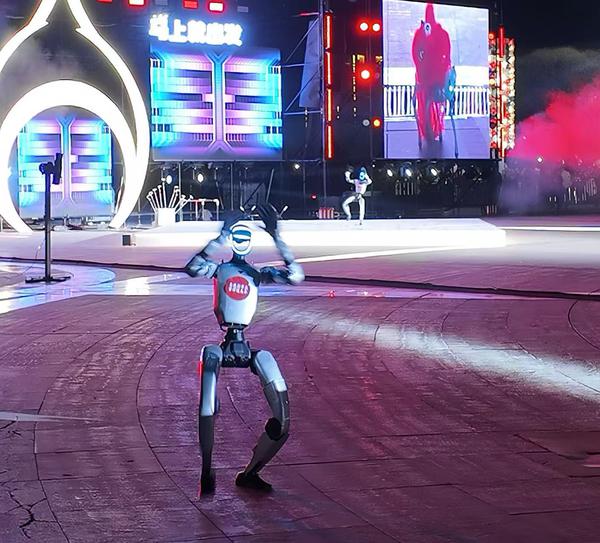 活动中,《机械狮舞》将精密齿轮结构与灵动舞狮技艺相结合,直观诠释了“古”与“新”的融合主题。随后,“宁夏花儿”的悠扬唱腔与现代国潮编曲相映成趣,让传统民歌焕发出青春色彩;《东方腔调·国潮大秀》则将中卫非遗剪纸艺术与现代服饰设计相结合;机器人表演,科技感十足,成为全场瞩目的亮点。