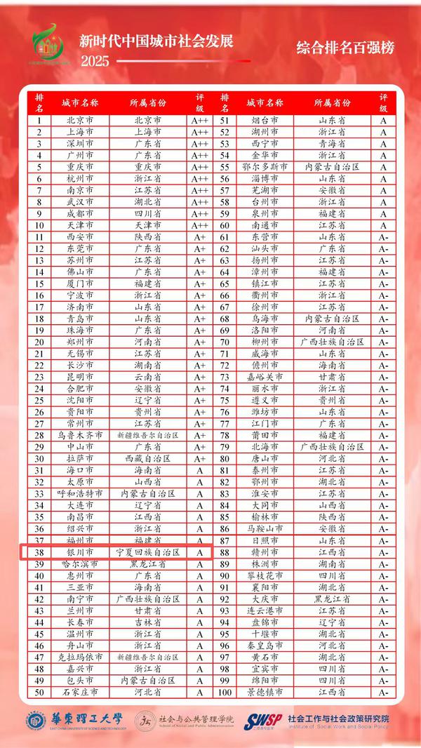 “新时代中国城市社会发展指数暨百强榜(2025)”是由上海高校智库“华东理工大学社会工作与社会政策研究院”何雪松教授和吴开泽研究员领衔的智库重点研究项目。根据“中国城市社会发展指标体系”,课题组利用可获得的2024年各类统计年鉴和统计公报数据,对全国297个地级以上城市进行了排名,银川市以评级为A的成绩位列全国第38位。