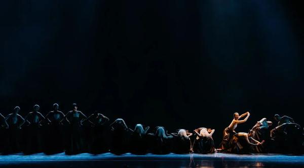 屏幕前,记者仿若置身贺兰山麓,27名舞者肩背随鼓点起伏颤动,如岩层般厚重沉稳;腾跃时挥洒的汗水在光影中熠熠生辉,他们以身体为刻刀,精准复刻出先民狩猎、祭祀的原始图景,最终凝聚成一座充满生命力的“人形岩山”。舞者们凭借关节的顿挫与肌肉的颤动,细腻模拟出岩石的粗糙肌理,让沉睡千年的岩画符号在舞台上缓缓“苏醒”。
