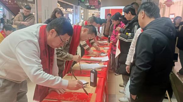 阅彩城圆厅中,络绎不绝的市民很快被书法家们刚劲有力的楷书、飘逸灵动的行书所吸引,大家围拢在书写台前,或挑选心仪联句,或与书法家交流讨教,孩子们好奇地观摩笔墨流转,感受汉字艺术的魅力。书法家们凝神聚气,挥毫泼墨,笔走龙蛇间,“骏马扬蹄追梦远,春风拂面报春新“龙马精神催骏步,芝兰气韵润华堂”等兼具传统韵味与马年特色的春联跃然纸上,让人爱不释手。居民们手捧刚写好的春联,脸上洋溢着幸福的笑容。志愿者们穿梭其间,帮忙铺纸、晾联、分发,现场一派其乐融融的景象。剪纸艺术家们红纸翻飞,剪刀舞动,一幅骏马奔腾的剪纸在国家级非物质文化遗产代表性传承人的指尖逐渐鲜活起来。昂扬的马首,飘逸的马鬃,再衬以象征富贵的牡丹与寓意坚韧的梅花,整幅圆形作品瞬间“活”了,传递出新春“马到成功”与“喜上眉梢”的双重祝愿。围观的市民纷纷收藏剪纸艺术品。