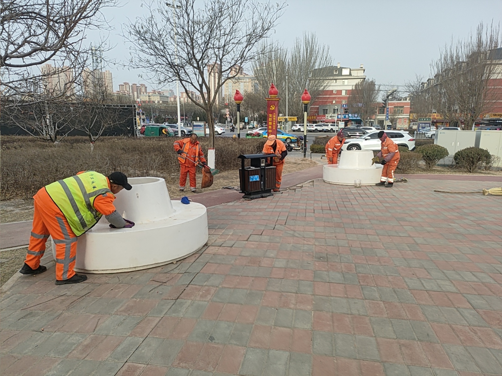 除了冲洗路面,城市家具的“颜值”也在同步提升。在西夏区同心街路段,环卫工人们用抹布仔细擦拭着近期积满灰尘的果皮箱、公交站牌和隔离护栏。这种“机械冲洗路面+人工擦洗家具”的立体作业模式,实现了从地面到公共设施的全面洁净。
