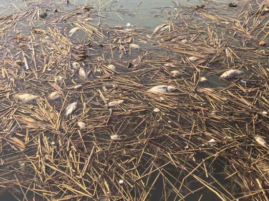 接到反映后,记者第一时间赶往徐女士所说的海宝公园栈桥附近。现场看到,水面上漂浮着芦苇、枯木等杂物,其中混杂着不少死鱼。集中出现死鱼的水域共有三处,均位于栈桥周边水域。记者仔细观察发现,除了死鱼,水面上还漂浮着乌龟、螃蟹等水生动物的尸体。
