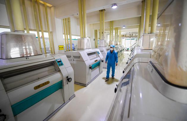 宁夏塞北雪面粉有限公司,一排排磨粉机整齐排列,工人正在巡视设备工作情况。
