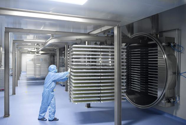 优乳(宁夏)生物工程有限责任公司,工作人员从冻干机中推出盛放着冻干成品的物料车。