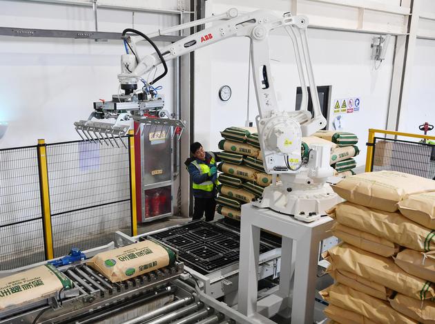 宁夏富杨食品有限公司,机械臂正在搬运乳粉产品。