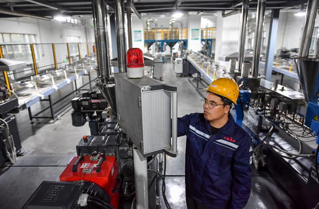 宁夏清研高分子新材料有限公司生产车间内,工作人员正在查看工程塑料挤出机的运转情况。