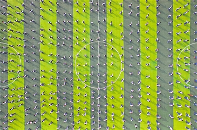 大课间,俯瞰银川市湖畔中学操场,同学们踏着音乐节拍跳起韵律操。