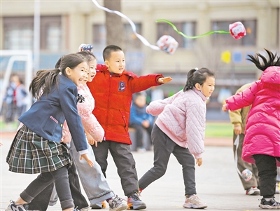 课间,孩子们的沙包在空中划出快乐的弧线。