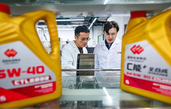 联合培养研究生尹昊(右)正向自己的企业导师、高端油品创新团队研究员何金学“取经”。