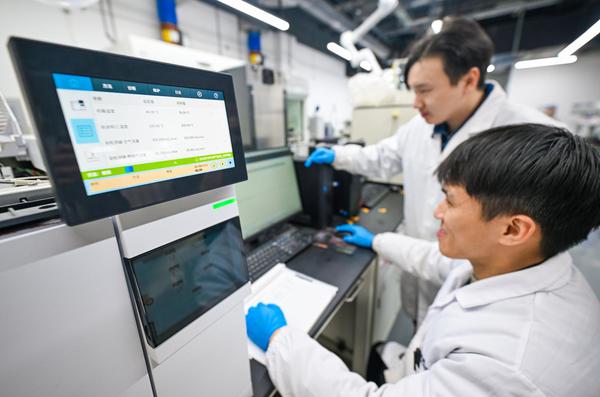 联合培养研究生尹昊(右)和高端油品创新团队研究员何金学分析油品数据。