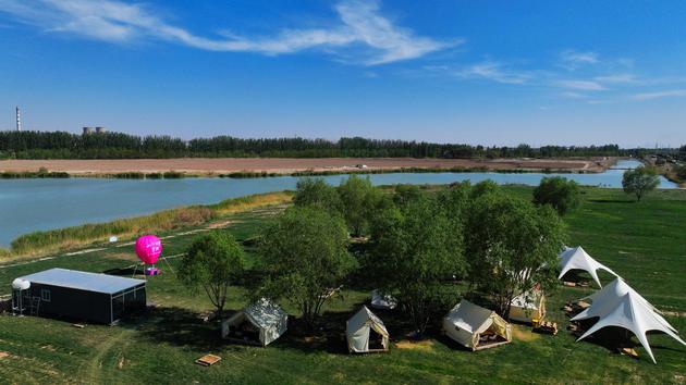 在银子湖西岸,有一大片绿色草坪,这里是一片露营地,不少市民游客选择来此,踏着厚厚草地,欣赏着银光闪烁的湖面。在营地帐篷里,三五好友聚在一起,畅饮聊天,尽情享受自然之趣。