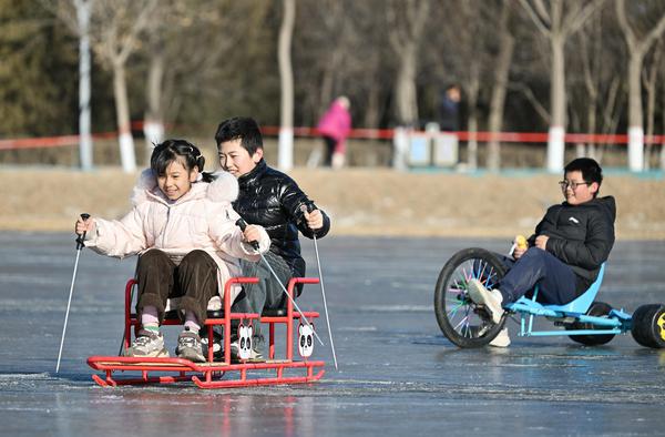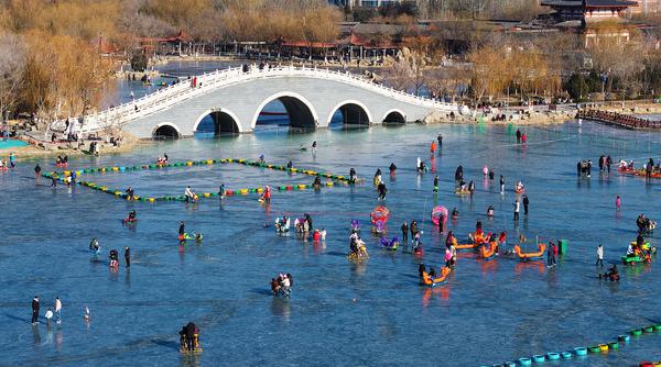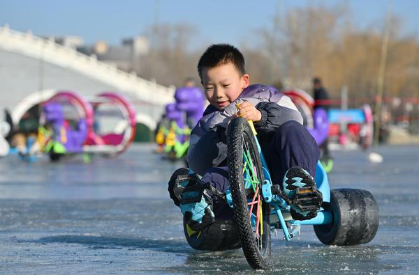 与此同时,城市公园的冰上乐园成为市民休闲的“宝藏去处”。北塔湖公园、宝湖公园、丽景湖公园打造的冰上体验区,推出冰上竞速赛车、传统冰车、滑雪圈、冰上自行车等多样项目,兼顾趣味与参与性,吸引全年龄段游客踊跃加入。冰面之上欢声不绝,孩童嬉戏玩闹,成年人重温童趣,冬日的寒意在这份热闹中悄然消散。