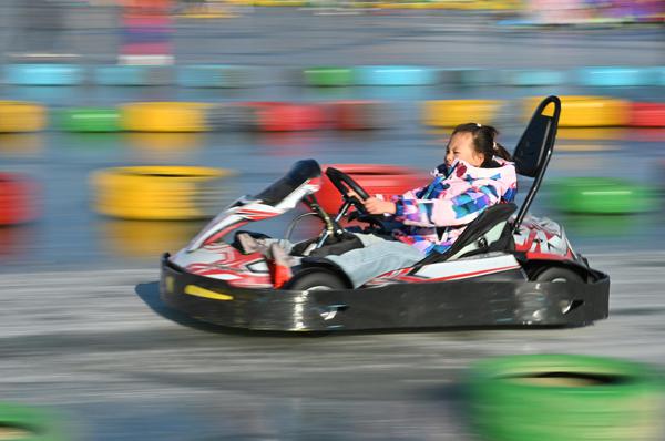 孩子们驾驶卡丁车在冰上竞速。