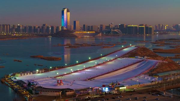 1月17日,日落时分,银川阅海滑雪场灯光亮起,雪道与远处流光溢彩的城市灯光相映成趣。