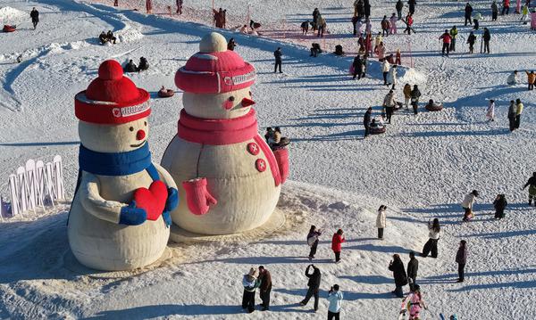 两座十余米高的巨型卡通雪人傲然矗立在银川阅海滑雪场。