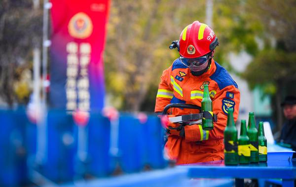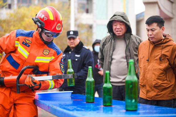消防员精细操作,现场展示用液压扩张器夹玻璃瓶。