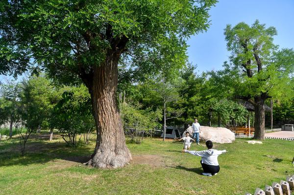 市民在由沉陷矿坑“变身”的贺兰山运动公园里“遛娃”,畅享生态治理成果。