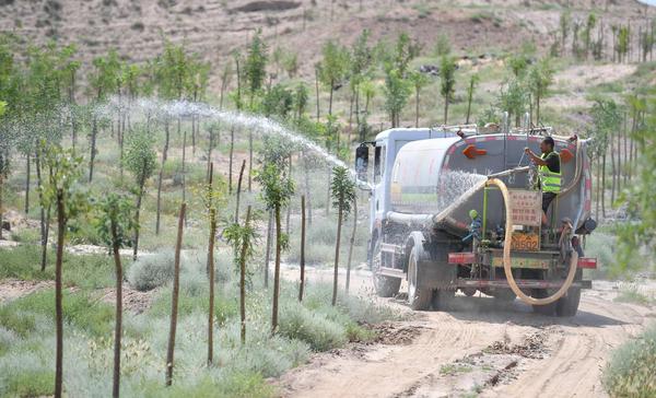 在中卫市沙坡头区涩井沟历史遗留矿山生态保护与修复综合治理项目现场,工作人员正在为树木浇水。