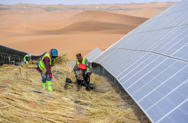 中卫市腾格里沙漠,工人推动轧草车铺设草方格,效率翻倍。